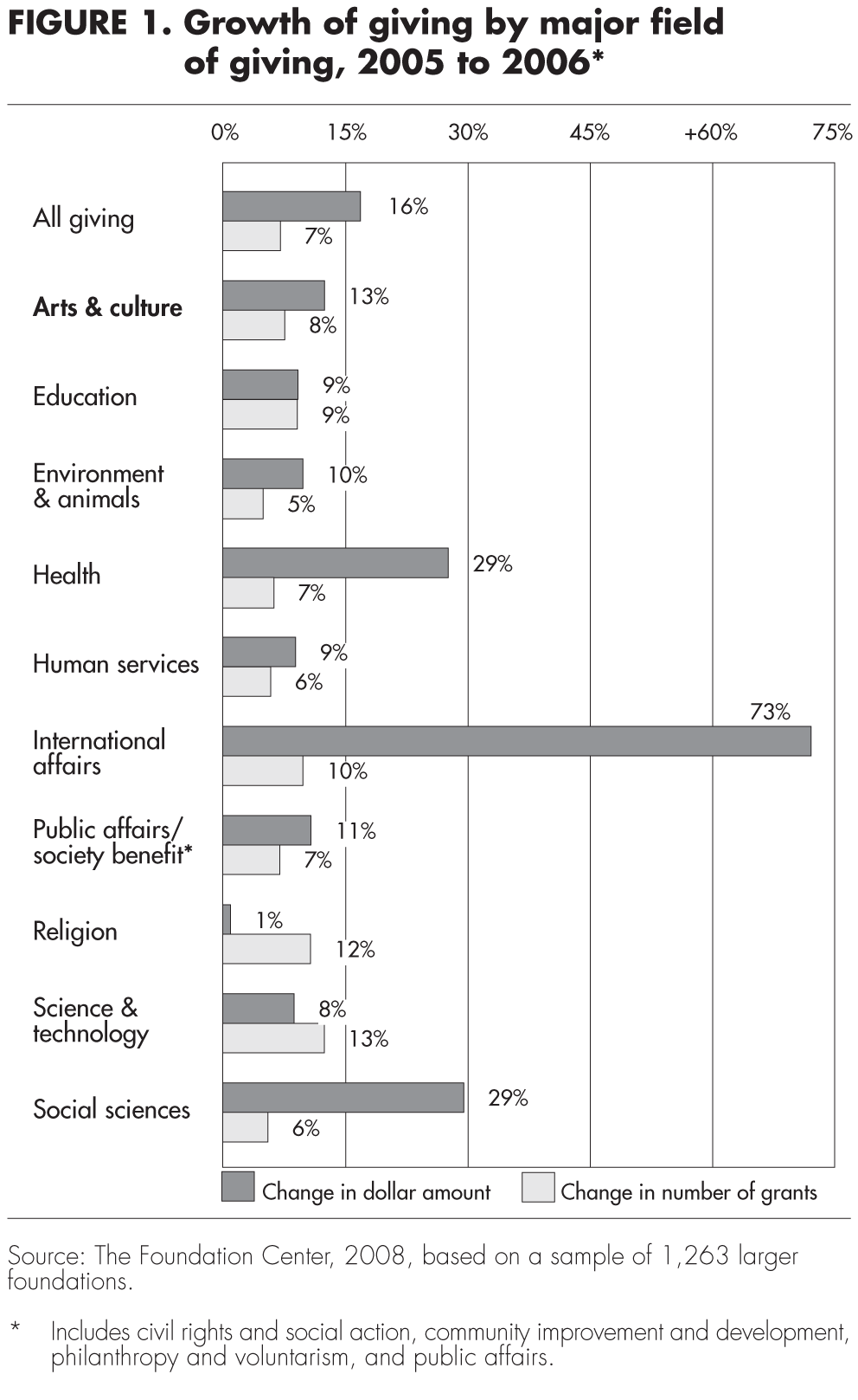 Overall foundation dollars for the arts. Unadjusted grant dollars for arts and culture from the 1,263 larger foundations in the Foundation Center’s sample increased by $275.1 million, from $2.05 billion in 2005 to $2.33 billion in 2006.3