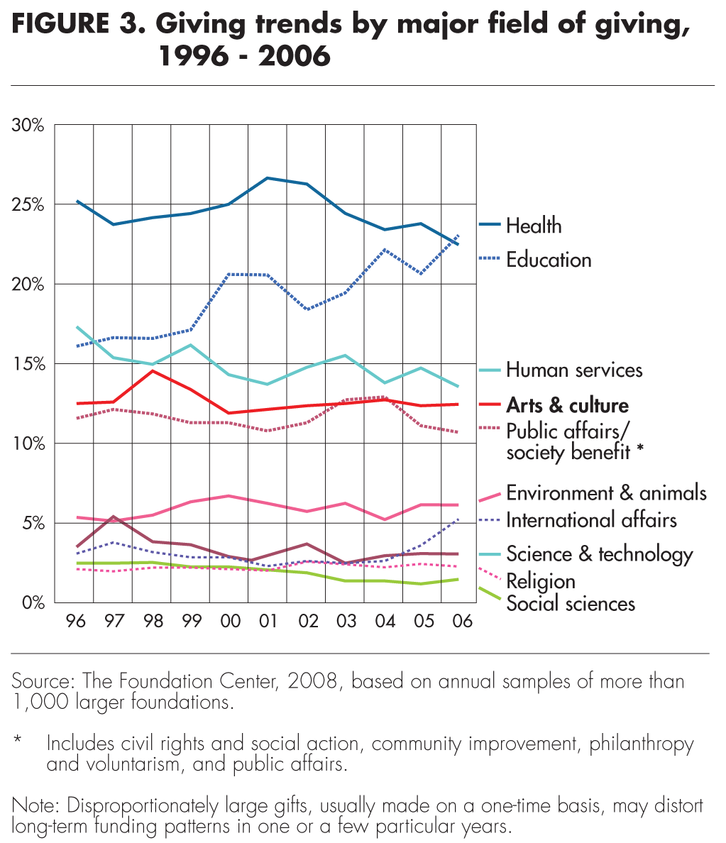The impact of exceptionally large grants. Every year and in all funding areas, a few very large grants can skew overall totals, creating distortions in long-term grantmaking trends. In 2006, 18 arts and culture grants totaled at least $10 million, and instances where these grants had a notable impact on grantmaking patterns are identified in the following analyses. Yet despite the potential fluctuations caused by these exceptional grants, Foundation Center data in all fields have always included them, providing consistency over time. (In addition, the Foundation Center provides statistics based on share of number of grants, which are not skewed by exceptionally large grants.)