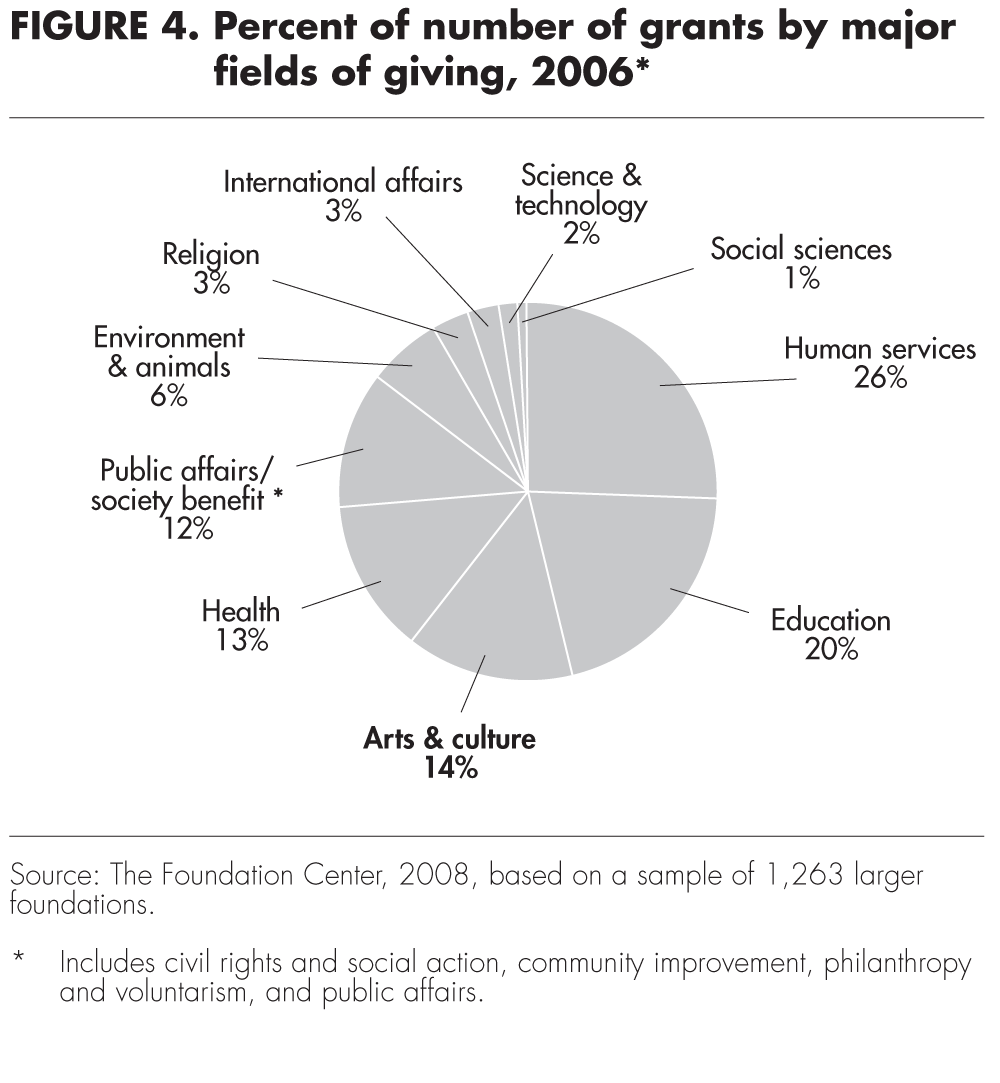 Number of grants. In terms of the number of foundation grants given rather than the total dollar amount, the arts’ share of all foundation grants was unchanged at 14.3 percent in 2006 (figure 4). The actual number of grants increased by 1,397, from 18,698 to 20,095 — the highest number of arts and culture grants tracked for a single year in the sample.