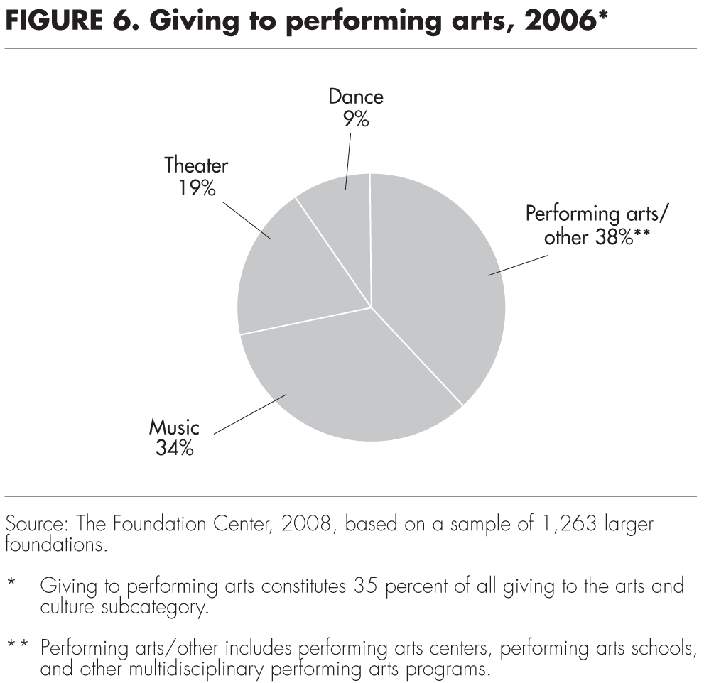 The largest share of giving to the performing arts (figure 6) supported the performing arts generally (including performing arts centers and education), followed by music (including symphony orchestras and opera), theater, and dance. The performing arts received more funding than museums in 2006 based on share of arts grant dollars, as well as share of number of arts grants (41.1 percent vs. 20.9 percent). In general, the average performing arts grant tends to be smaller in size than the average museum grant. In 2006, 63 percent of all funders in the Foundation Center sample supported the performing arts.