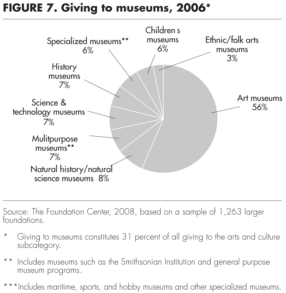 Giving to museums. Grant dollars allocated to museums increased by 4.1 percent between 2005 and 2006, from $682.7 million to $710.9 million. The number of grants increased by 5.1 percent, from 3,994 to 4,196. Among museum types (figure 7), the largest share of 2006 funding supported art museums (56.4 percent), although this share was slightly lower than in the previous year (57.8 percent). Nonetheless, actual grant dollars for art museums rose between 2005 and 2006. Grant dollars also increased between 2005 and 2006 for multipurpose museums,4 children’s museums and other specialized museums,5 ethnic/folk arts museums, marine/maritime museums, natural history/natural science museums, and sports/hobby museums. By comparison, grant dollars decreased for history museums and science and technology museums. In the Foundation Center’s 2006 sample, 60 percent of all funders supported museum activities.