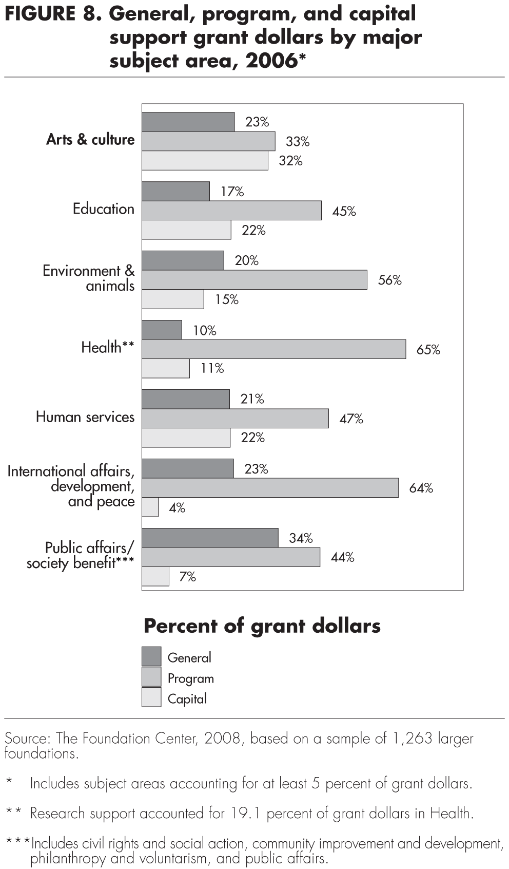 The arts compared to other foundation fields of giving. The three largest categories of support tracked by the Foundation Center are program support, capital support, and general operating support. See figure 8 for a comparison in these three categories of dollars going to arts and culture with grant dollars going to other major foundation subject areas.