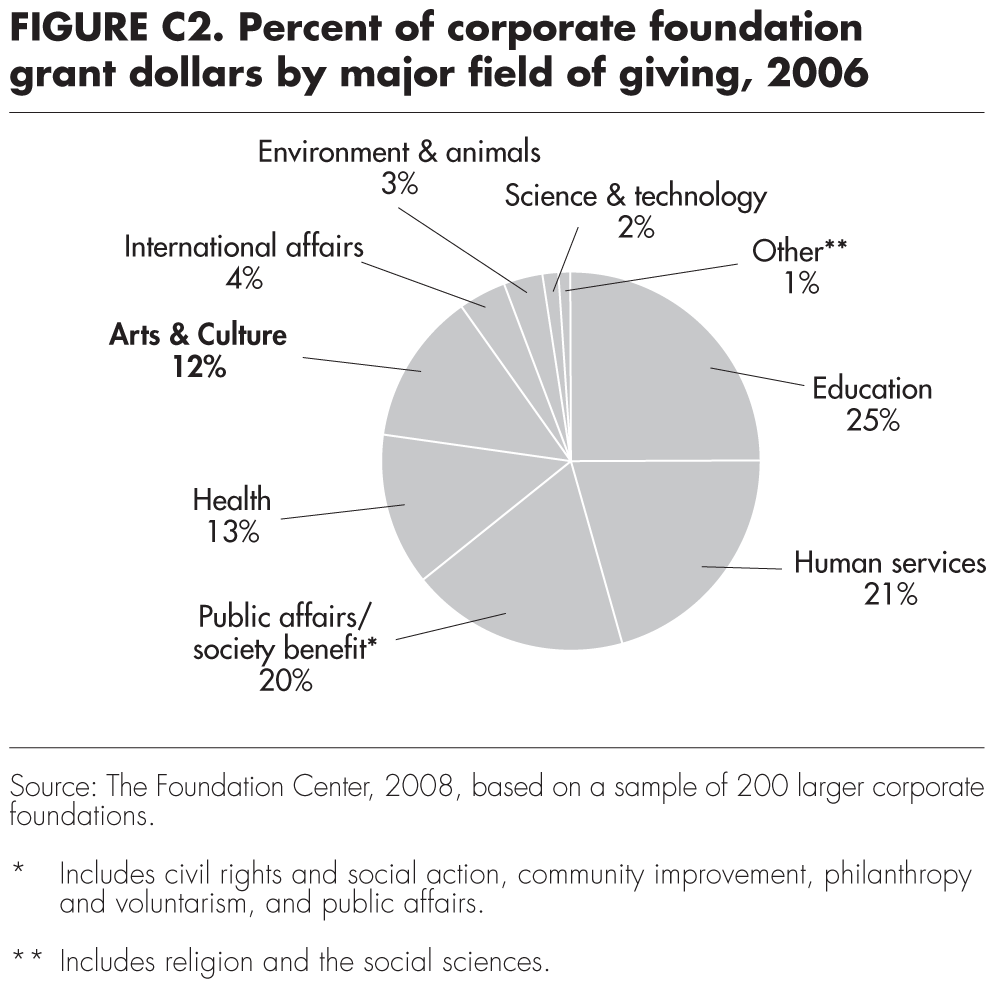 They following analyses are based on arts grants of $10,000 or more reported to the Foundation Center by 200 of the largest U.S. corporate foundations. Findings do not reflect direct corporate giving, which accounts for the majority of charitable contributions by U.S. corporations.