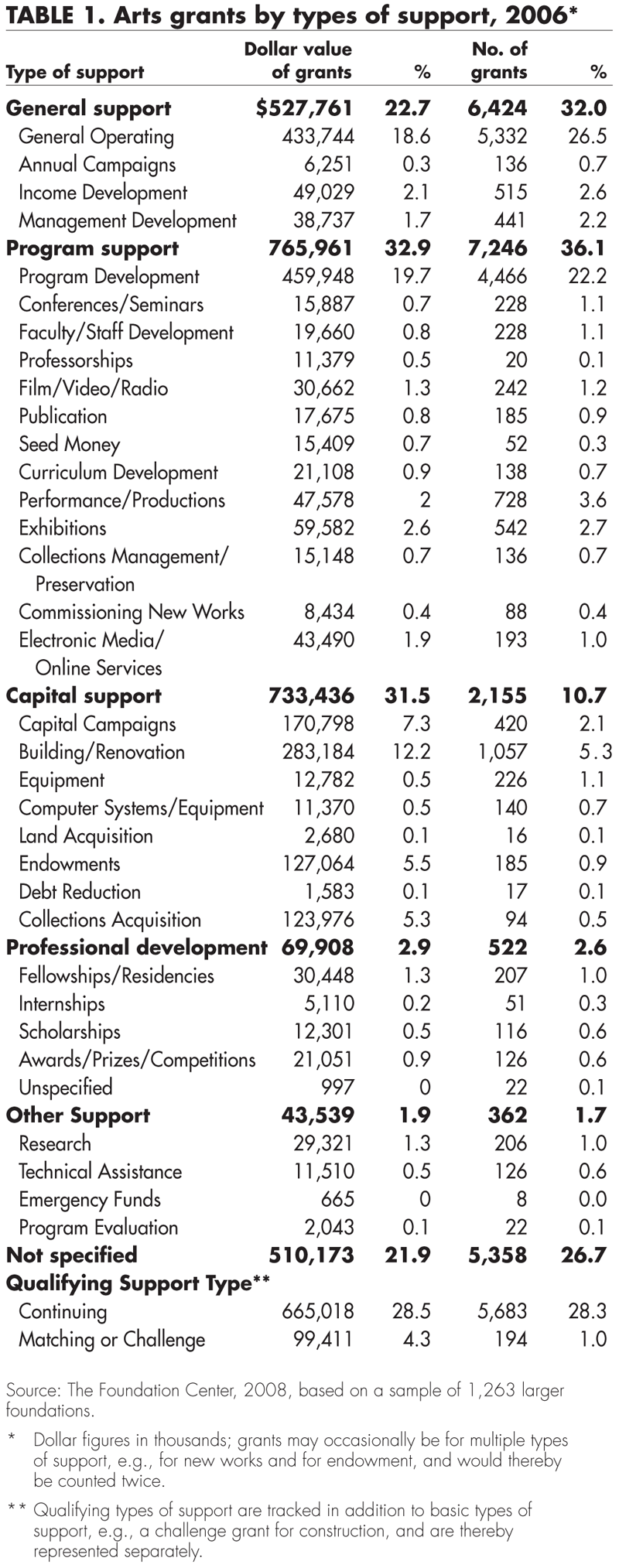 Arts grants by specific types of support. Table 1 provides a breakdown of more specific types of support within the larger support categories and lists both the specific dollar value and number of grants made in each type. As with all data in the Snapshot, it is important to keep in mind that this table includes only grants of $10,000 or more awarded to organizations by a sample of 1,263 larger foundations. It is also important to note that for nearly 22 percent of the arts grant dollars in this sample, the type of support was not specified.