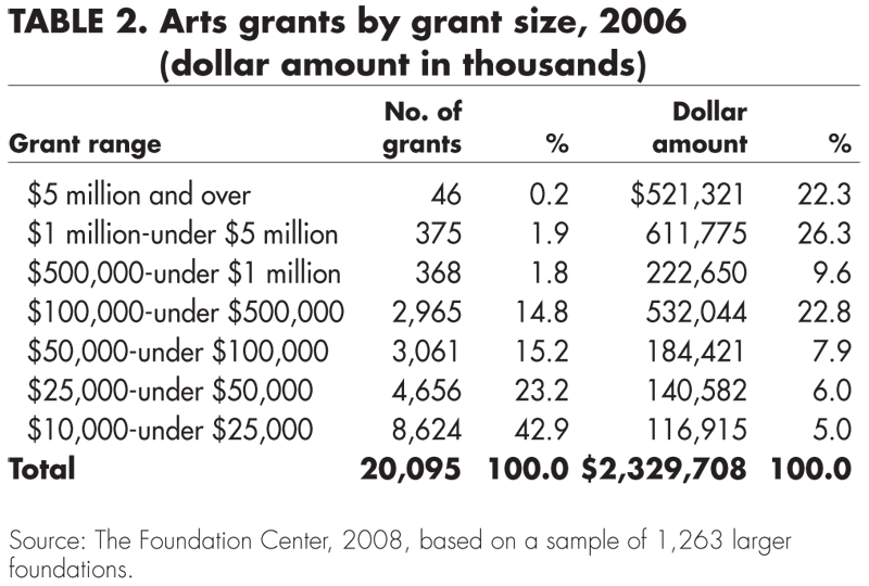 Small and mid-sized grants. Two-thirds (66.1 percent) of all arts grants in the 2006 sample were for amounts between $10,000 and $49,999 table 2), slightly more than the 2005 share. By comparison, the share of mid-sized arts grants ($50,000 to $499,999) decreased slightly to 30 percent.