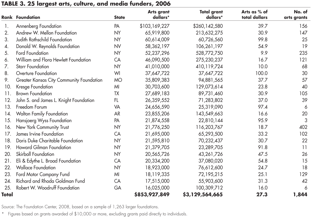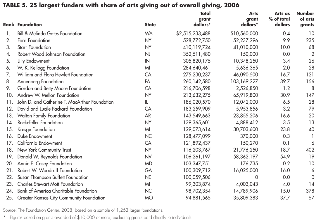 Arts giving by the 25 largest funders overall. Among the 25 largest foundations by overall giving in the sample, only one made no grants for arts and culture in 2006 (table 5). Nonetheless, levels of arts funding varied widely, with 11 foundations allocating at least 10 percent of their overall giving for the arts, while six provided 1 percent or less.