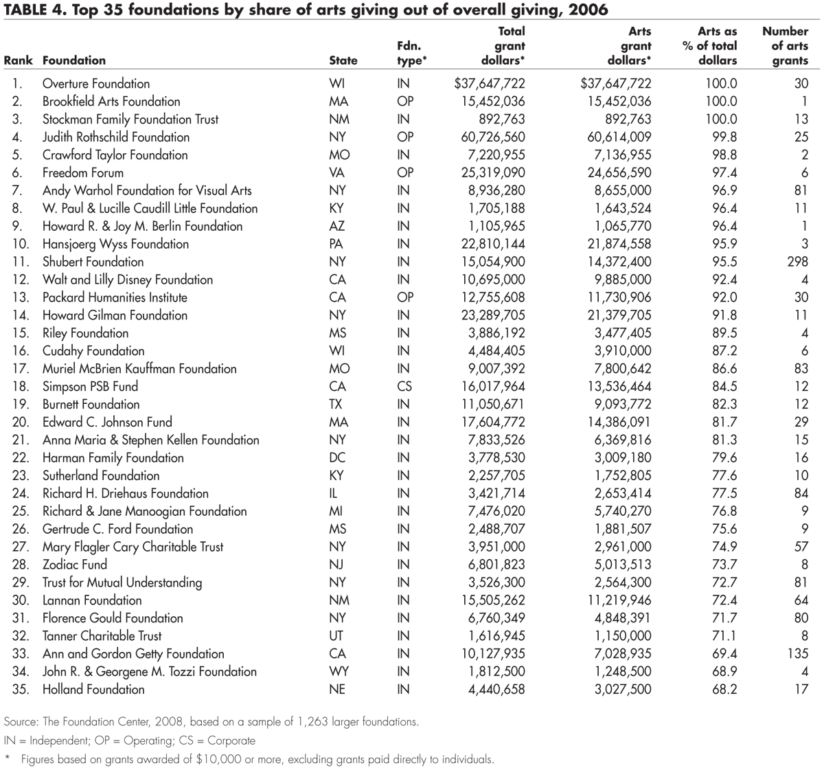 Top foundations by share of arts giving out of overall giving. Of the foundations that committed large percentages of their grant dollars to arts and culture, many are the smaller foundations in the sample (table 4). Among the top 100 foundations ranked by share of arts giving out of total giving, 62 foundations gave less than $5 million in total arts grant dollars in 2006. This number would be greater if grants of less than $10,000 were included, because some arts funders will either primarily or exclusively award arts grants of less than $10,000 each.