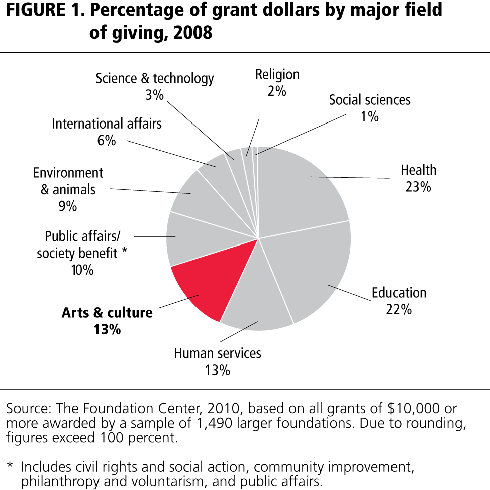- The original research upon which this report is based was conducted by the Foundation Center. Specifically, the source for data was the Foundation Center’s Foundation Giving Trends: Update on Funding Priorities (2010) report and the grants sample database. The data for “circa 2008” include all grants of $10,000 or more awarded by 1,490 of the largest US foundations and reported to the Foundation Center between June 2008 and July 2009. Two-thirds of grant dollars represent 2008 grant authorizations or payments, with the balance reflecting 2007 authorizations or payments. (The incorporation of “older” data reflects delays in the availability of timely grants information.) The grants sample typically represents about half of total grant dollars awarded annually by the more than 75,000 active US independent, corporate, and community foundations that the Foundation Center tracks. (The sample also captures roughly half of all foundation giving for arts and culture.) For community foundations, only discretionary and donor-advised grants were included. Grants to individuals were not included.