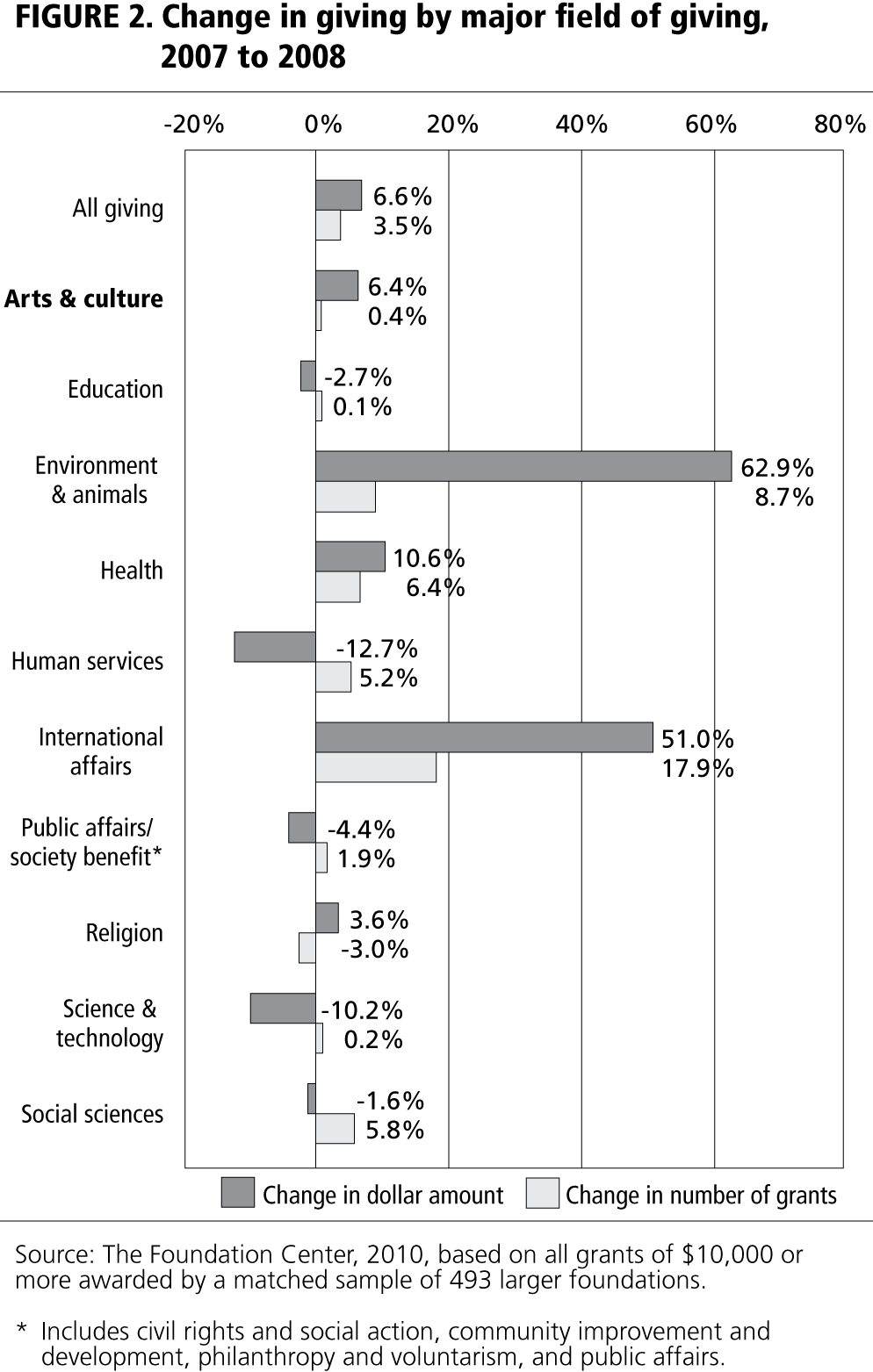 Overall foundation dollars for the arts. The 1,490 larger foundations included in the Foundation Center’s 2008 sample awarded 22,902 arts and culture grants totaling $3.2 billion, or 12.5 percent of overall grant dollars (figure 1). Arts giving rose 6.4 percent between 2007 and 2008, nearly equaling the 6.6 percent increase in grant dollars overall. (With an inflation rate of close to 4 percent, this reflected a real overall increase of 2.6 percent and 2.4 percent for arts giving.) Among the nine other major subject areas tracked by the Foundation Center, only the environment, international affairs, and health showed faster growth during this period. Moreover, five of the areas registered declines in grant dollars: education, human services, public affairs/society benefit, science and technology, and the social sciences (figure 2).