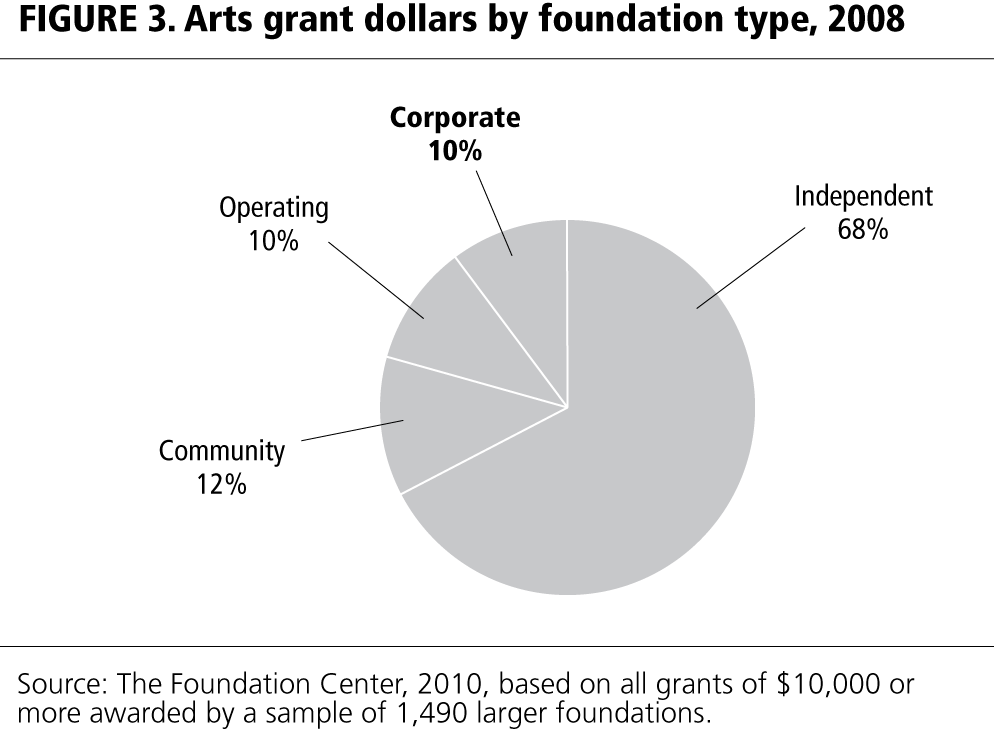Corporate foundations represent an important source of support for arts and culture. While corporate foundations account for less than 4 percent of US private and community foundations, the larger corporate foundations included in the 2008 grants sample provided 9.5 percent of grant dollars for the arts (figure 3). Actual grant dollars totaled $301 million. By number, corporate foundations allocated 4,569 grants, or 20 percent of the overall number of arts grants in 2008.