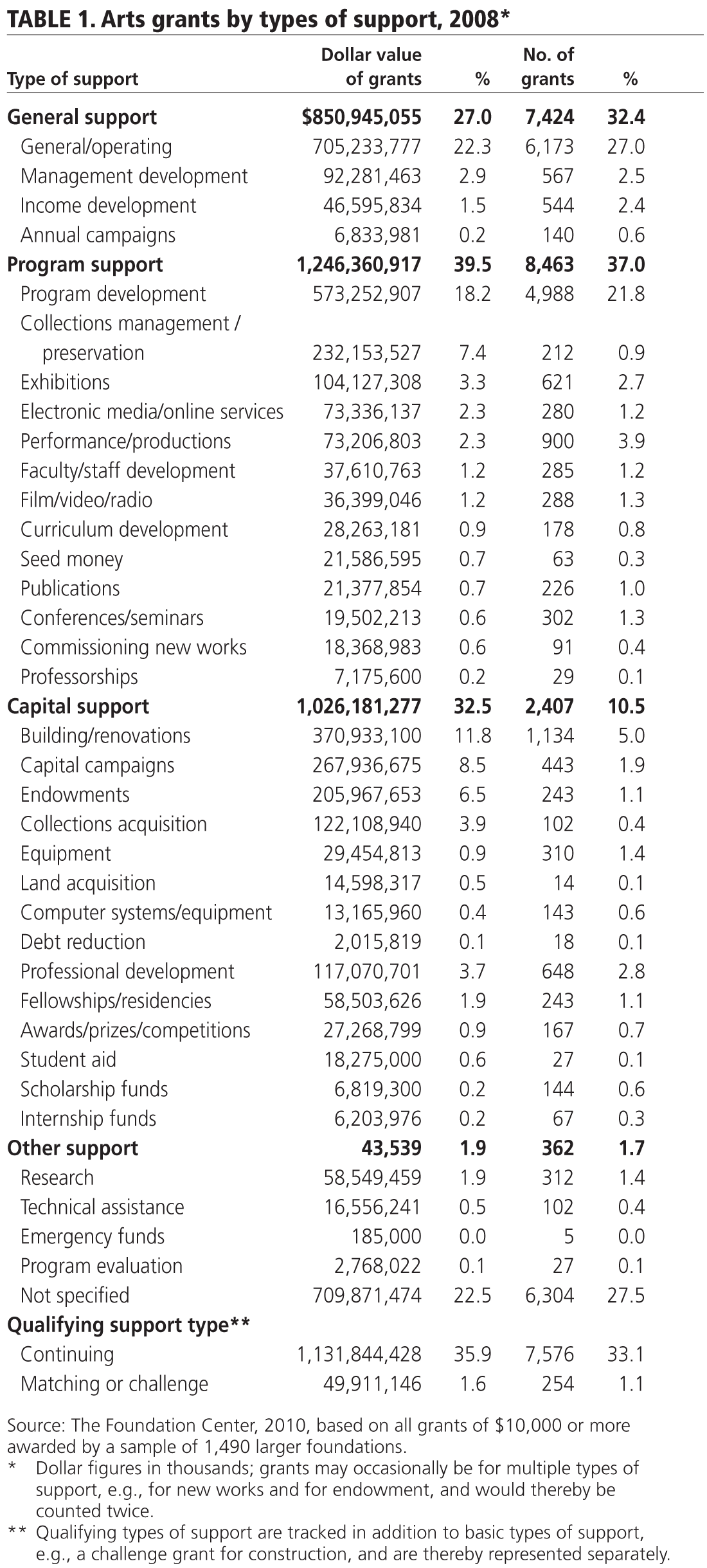 Arts grants by specific types of support. Table 1 provides a breakdown of more specific types of support within the larger support categories and lists both the specific dollar value and number of grants made in each type. As with all data in the “Snapshot,” it is important to keep in mind that this table includes only grants of $10,000 or more awarded to organizations by a sample of 1,490 larger foundations. It is also important to note that for close to 23 percent of the arts grant dollars in this sample, the type of support was not specified.