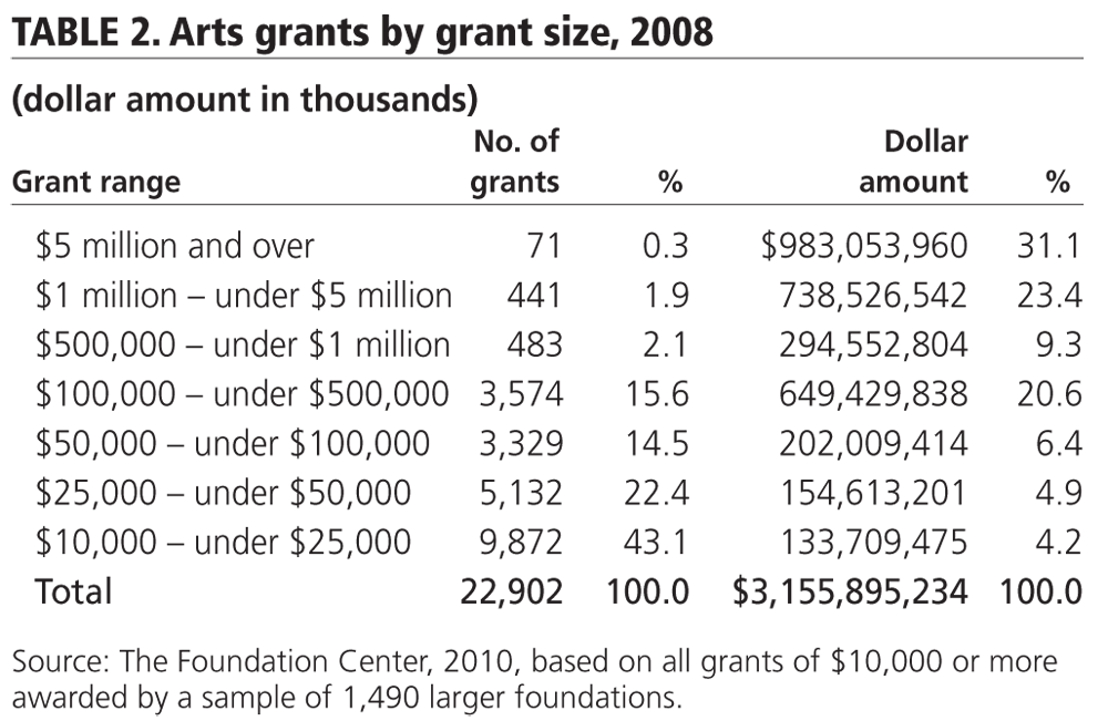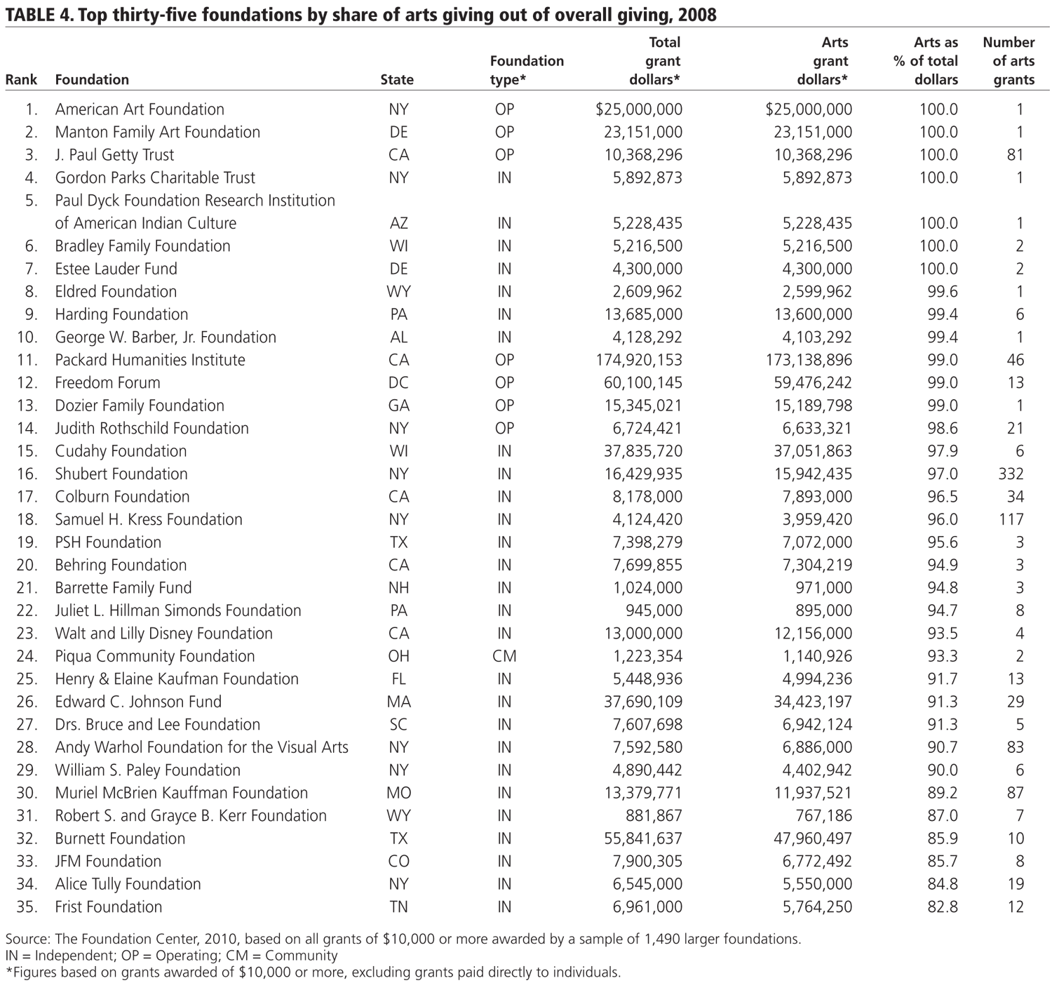 Top foundations by share of arts giving out of overall giving. Of the foundations that committed large percentages of their grant dollars to arts and culture, many are the smaller foundations in the sample (table 4). Among the top one hundred foundations ranked by share of arts giving out of total giving, just over half of foundations (fifty-one) gave less than $5 million in total arts grant dollars in 2008. This number would be greater if grants of less than $10,000 were included, because some arts funders will either primarily or exclusively award arts grants of less than $10,000 each.