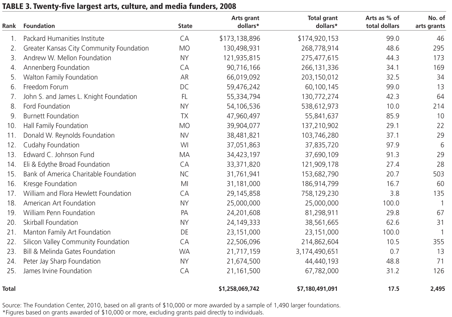 The twenty-five largest arts funders. The top twenty-five arts funders by giving amount provided nearly 40 percent of the total arts dollars in the Foundation Center’s 2008 sample (table 3), up from 34.3 percent in 2007. Overall, the share of giving accounted for by the top twenty-five arts funders has fallen between 33 and 39 percent since the end of the 1990s. While the share recorded for the latest year remains substantial, in the early 1980s the top twenty-five arts funders accounted for more than half of the grant dollars in the sample. This suggests that the base of large arts funders has widened since that time, making arts funding less concentrated among a small number of foundations.