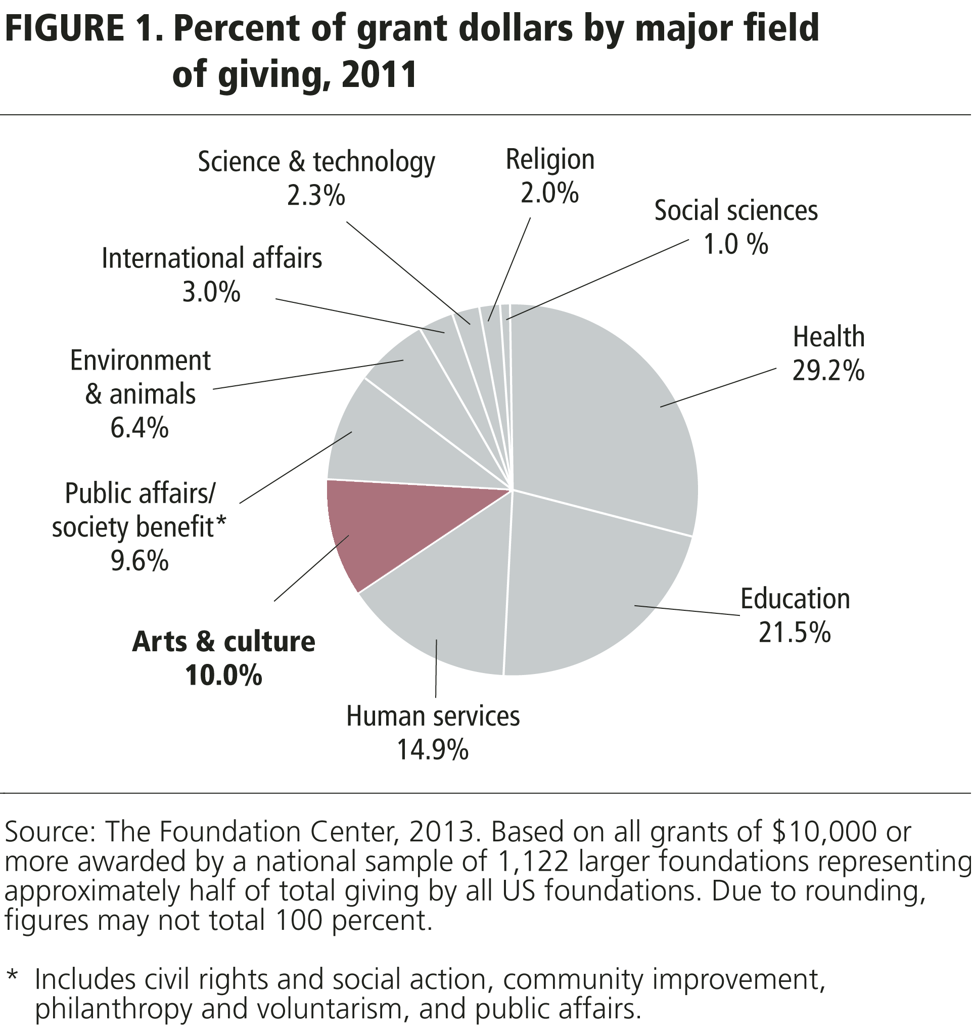 The impact of exceptionally large grants. Every year and in all funding areas, a few very large grants can skew overall totals, creating distortions in long-term grantmaking trends. In 2011, 15 arts and culture grants provided at least $10 million, and instances where these grants had a notable impact on grantmaking patterns are identified throughout this analysis. 3 Despite the potential fluctuations caused by these exceptional grants, Foundation Center data in all fields have always included them, providing consistency over time. (In addition, the Foundation Center provides statistics based on share of number of grants, which are not skewed by exceptionally large grants.)