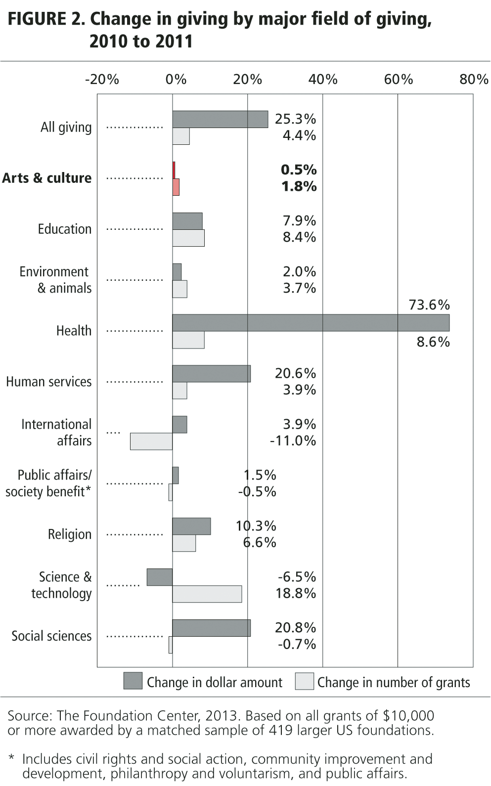 Foundation funding for arts and culture remained nearly unchanged in 2011, based on a matched set of leading grantmakers. Arts funding increased a marginal 0.5 percent between 2010 and 2011, compared to a 25.3 percent increase in overall giving by the matched set of 419 foundations. Nine out of the 10 major funding areas posted growth in giving. Health reported the largest increase (up 73.6 percent), due primarily to a number of exceptionally large grants awarded by the Bill & Melinda Gates Foundation.