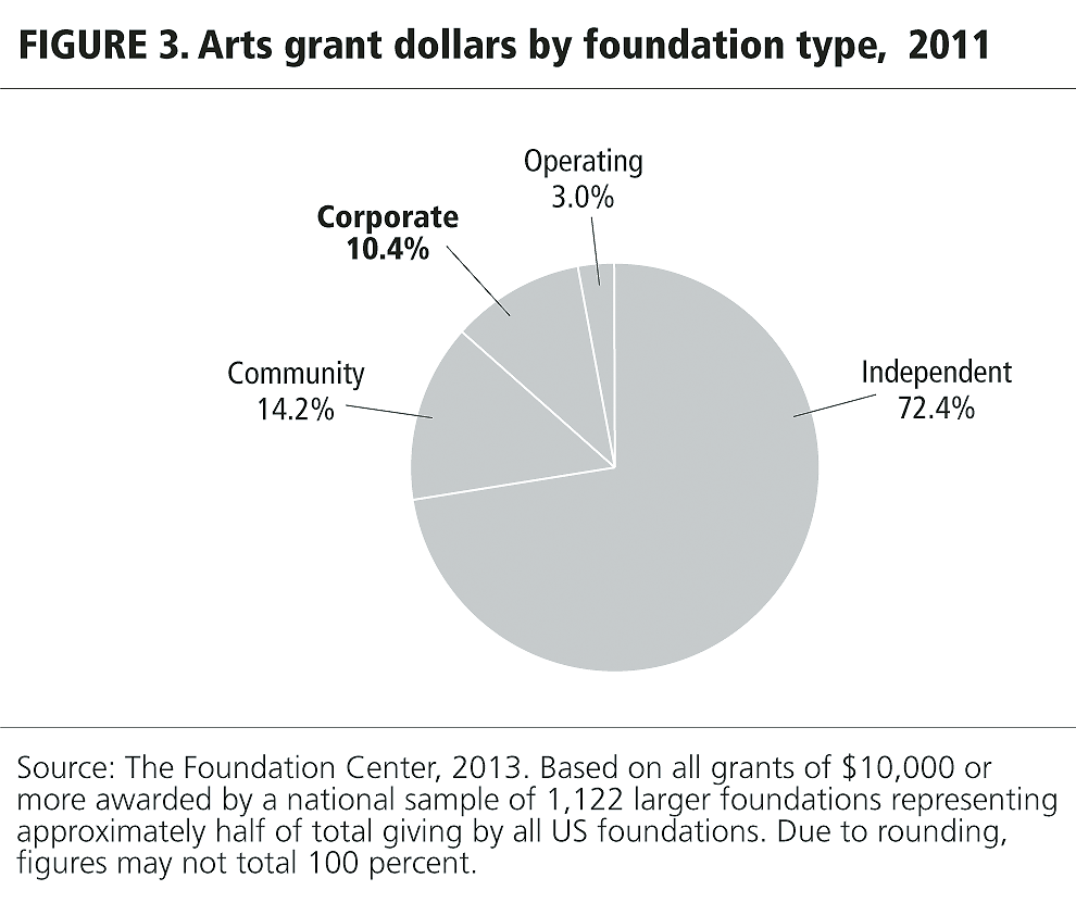 Corporate foundations represent an important source of support for arts and culture. While corporate foundations account for less than 4 percent of US private and community foundations, the larger corporate foundations included in the 2011 grants sample provided 10.4 percent of grant dollars for the arts (figure 3). Actual grant dollars totaled $244.1 million. By number, corporate foundations allocated 3,707 grants, or 19 percent of the overall number of arts grants in 2011.