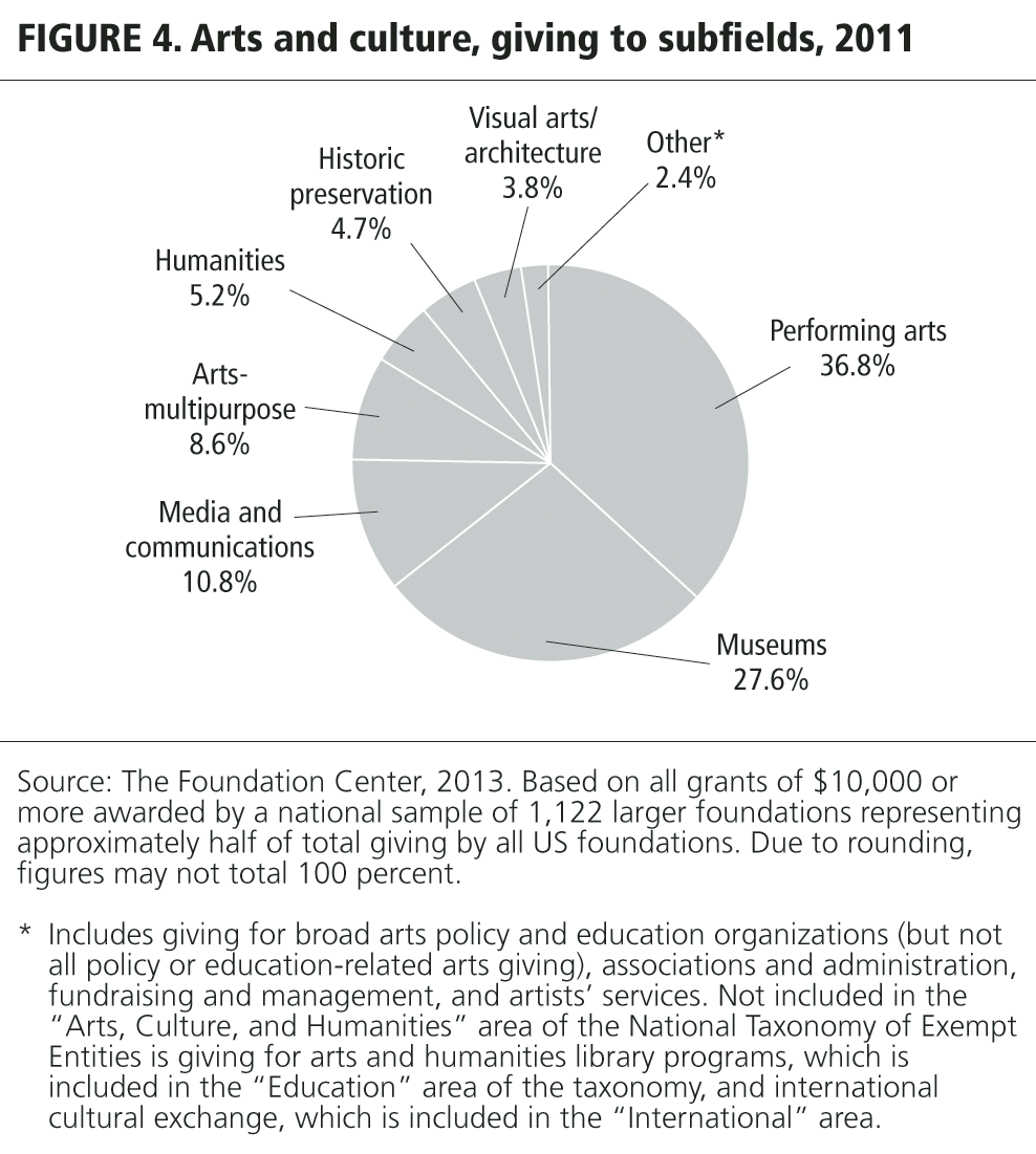 - Source of the data. The original research upon which this report is based was conducted by the Foundation Center. Specifically, the source for data was the Foundation Center’s Grants Stats posted on the Gain Knowledge section of the Center’s website and the grants sample database. The data for “circa 2011” include all grants of $10,000 or more awarded by 1,122 of the largest US foundations and reported to the Foundation Center between August 2011 and September 2012, excluding three grants made by the Walton Family Foundation to the Crystal Bridges Museum of American Art totaling $1.2 billion. Approximately three-fifths of grant dollars represent 2011 grant authorizations or payments, with the balance reflecting 2010 authorizations or payments. (The incorporation of “older” data reflects delays in the availability of timely grants information.) The grants sample typically represents about half of total grant dollars awarded annually by the more than 80,000 active US independent, corporate, and community foundations that the Foundation Center tracks. (The sample also captures roughly half of all foundation giving for arts and culture.) For community foundations, only discretionary and donor-advised grants were included. Grants to individuals were not included.