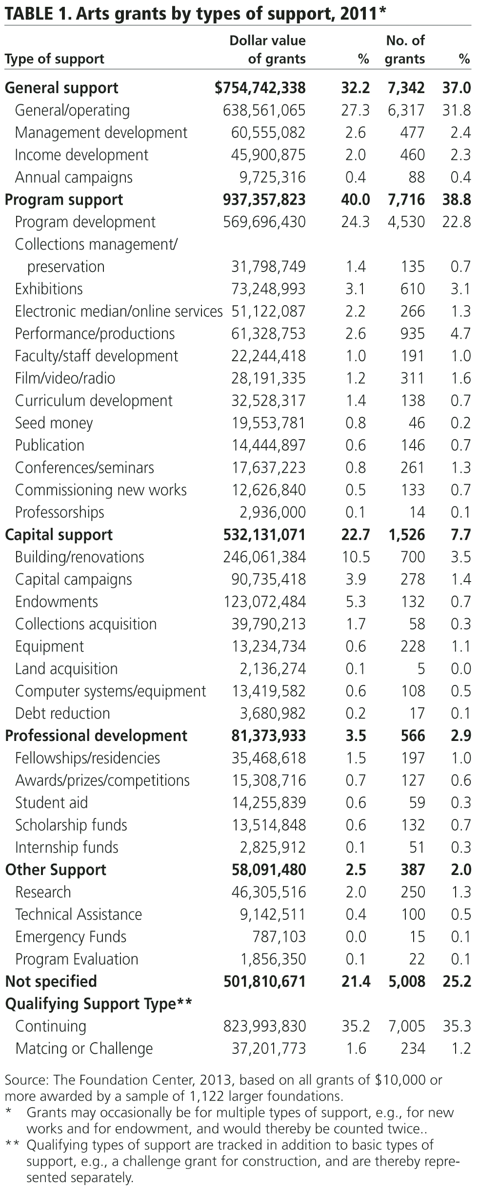 Arts grants by specific types of support. Table 1 provides a breakdown of more specific types of support within the larger support categories and lists both the specific dollar value and number of grants made in each type. As with all data in the Snapshot, it is important to keep in mind that this table includes only grants of $10,000 or more awarded to organizations by a sample of 1,122 larger foundations. It is also important to note that approximately 21 percent of the arts grant dollars in this sample were not specified for a type of support.
