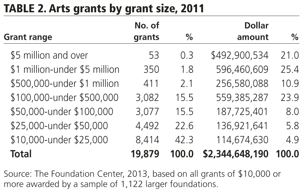 Large grants. The share of larger arts grants ($500,000 and over) increased to 4.2 percent of the total number of arts grants in 2011, compared to 3.4 percent in 2010. Their share of total grant dollars was also higher at 57.3 percent, compared to 54.8 percent in 2010. Overall, foundations in the sample made 112 arts grants of at least $2.5 million in 2011, up from 93 in 2010.