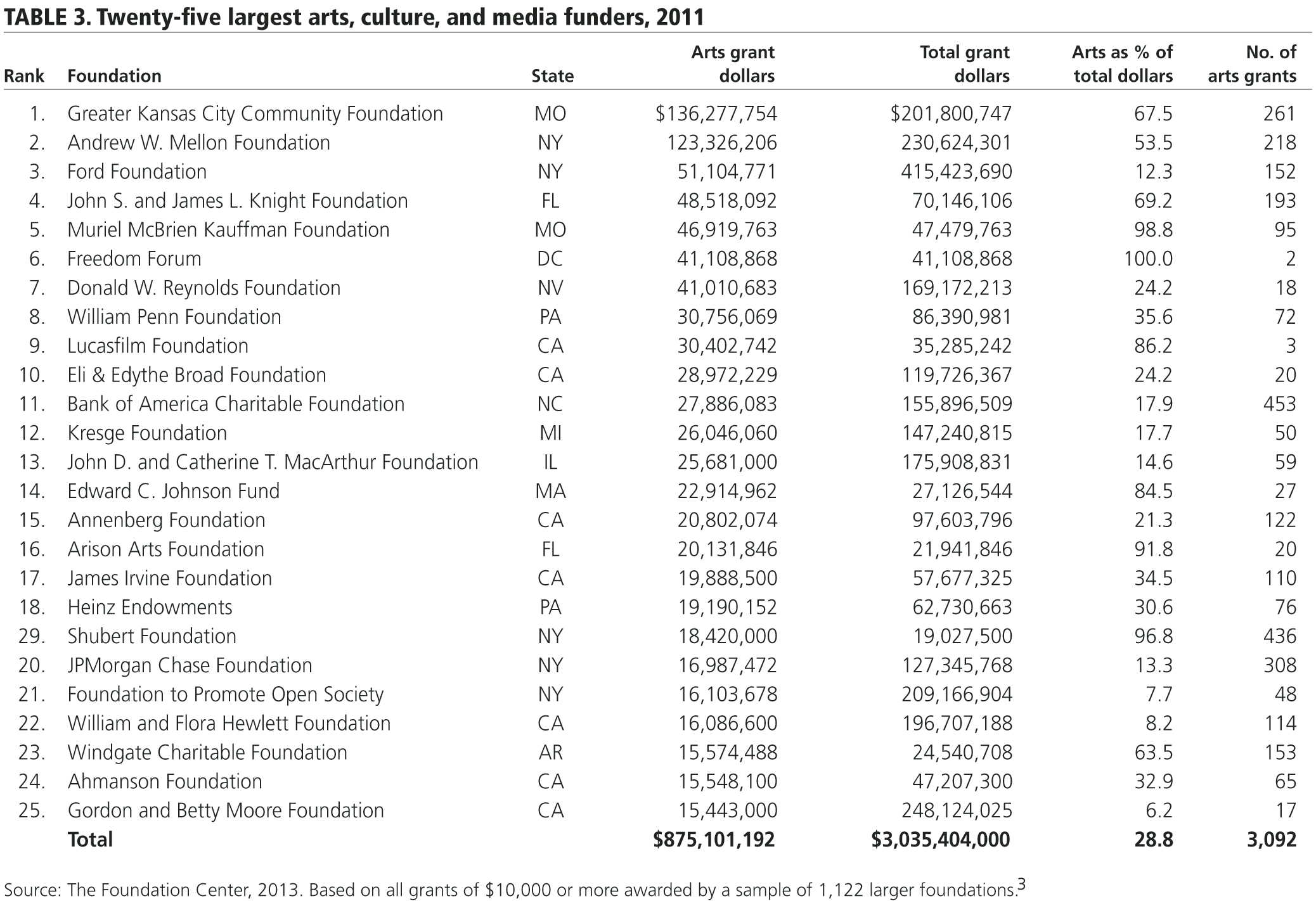 The 25 largest arts funders. The top 25 arts funders by giving amount provided 37.3 percent of the total arts dollars in the Foundation Center’s 2011 sample (table 3), down from 38.5 percent in 2010. Overall, the share of giving accounted for by the top 25 arts funders has fluctuated between 33 and 39 percent since the end of the 1990s. By comparison, in the early 1980s, the top 25 arts funders accounted for more than half of the grant dollars in the sample. This suggests that the base of large arts funders has widened since that time, making arts funding less concentrated among a small number of foundations.