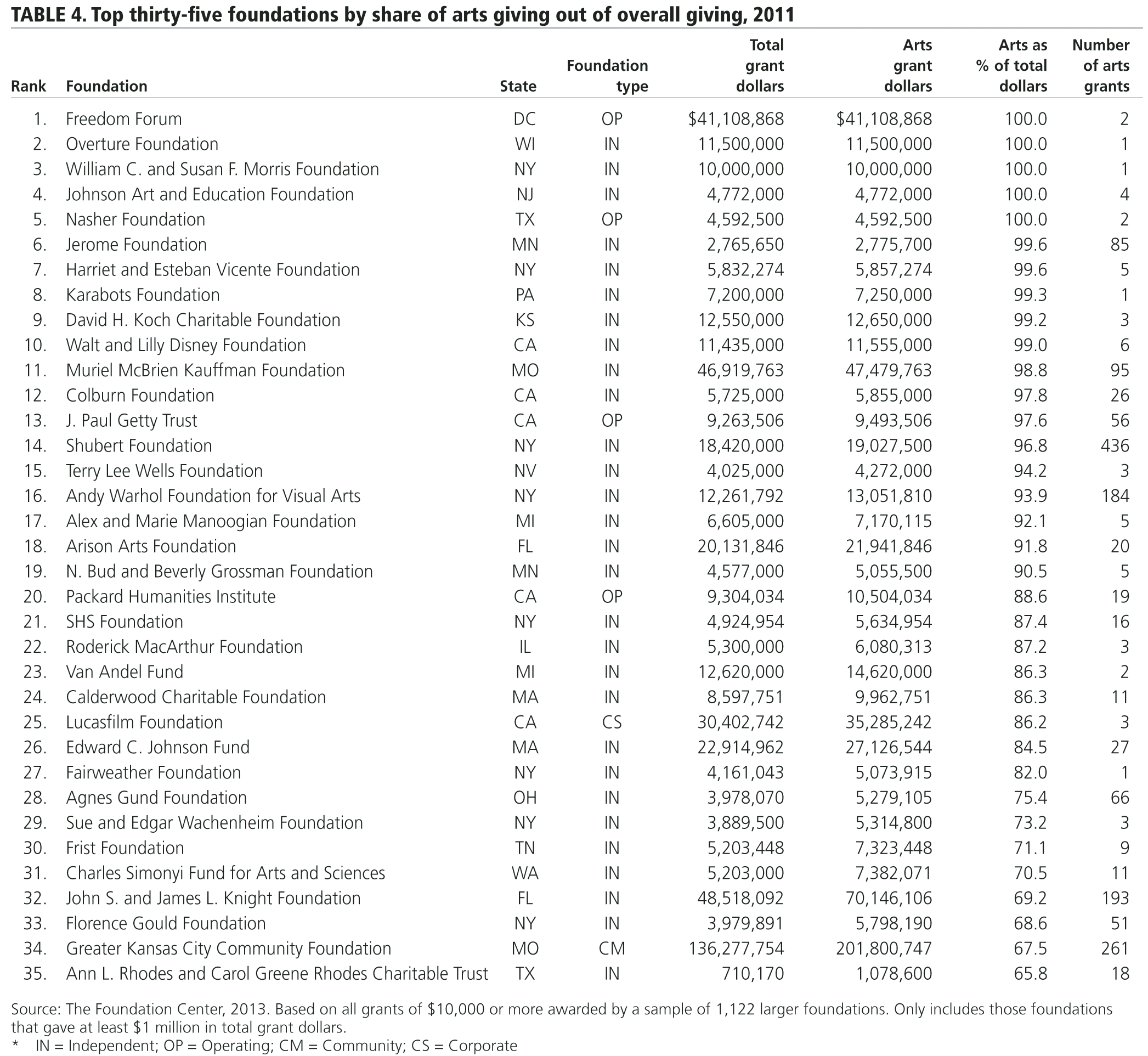 Top foundations by share of arts giving out of overall giving. Of the foundations that committed large percentages of their grant dollars to arts and culture, many are the smaller foundations in the sample (table 4). Among the top 100 foundations ranked by share of arts giving out of total giving, over half of foundations (54) gave less than $5 million in total arts grant dollars in 2011.