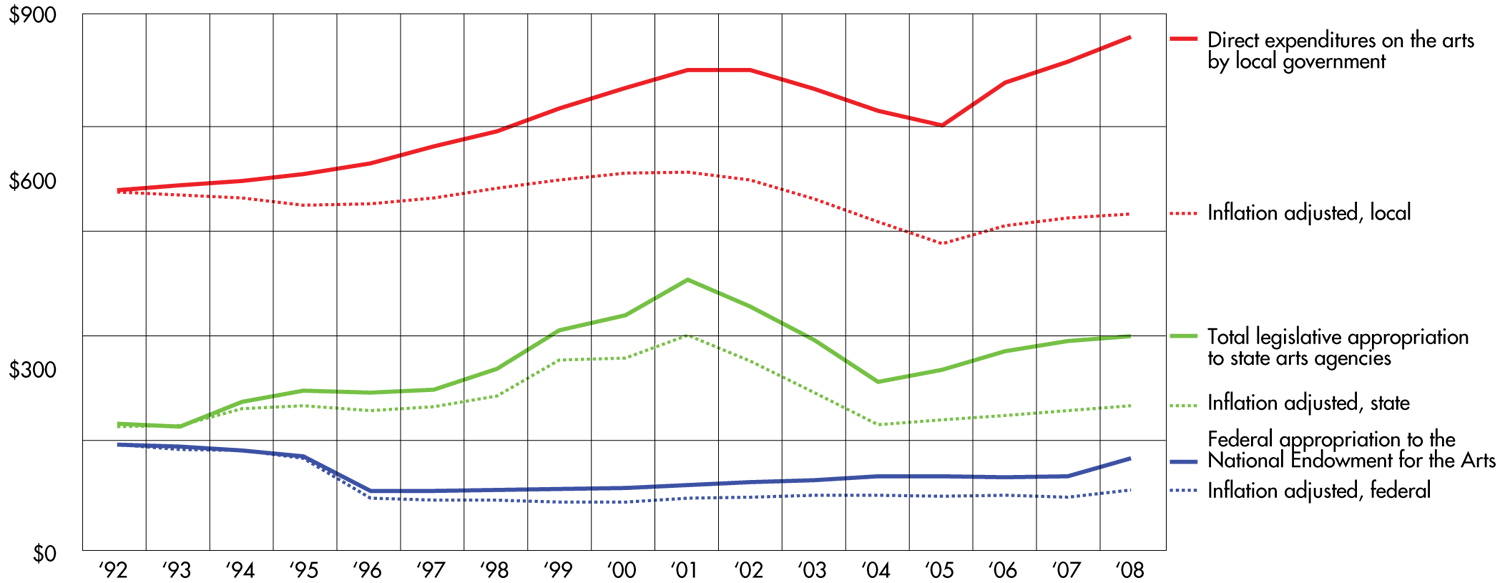 Congressional funding for the National Endowment for the Arts increased by $20 million in 2008 — the largest increase in nearly 30 years. The current funding level of $145 million, however, is still lower than the 1992 appropriation of $176 million. State and local spending on the arts is recovering after sharp contractions in the economy forced government funding cutbacks across many policy areas between 2001 and 2004. Although the long-term growth in total public funding is a notable achievement in a competitive fiscal environment, government arts support at all three levels has been challenged to keep pace with the costs of living and doing business. Despite recent increases, only state arts agency appropriations currently exceed 1992 funding levels when adjusted for inflation.
