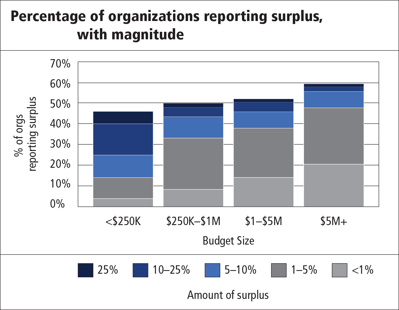 Continuing a trend that started in 2011, the percentage of arts, culture, and humanities organizations reporting deficits has declined to 24 percent. When asked about anticipated financial results for 2015, 75 percent of organizations expect to end the year at breakeven or better. While heartening, we recognize that the trend of stronger financial performance does not necessarily mean organizations are receiving the types and amounts of revenue that will truly cover the full cost of their operations. Surpluses were slim: 44 percent of organizations reported that their surplus was between 1 and 4 percent, and 20 percent of organizations reported a surplus of less than 1 percent.
