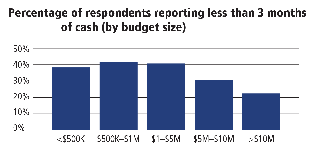 A key indicator of a more sustainable or adaptable organization is the amount of cash that it has to weather downturns, mitigate risks, and take advantage of new opportunities. To be clear, the appropriate amount of cash will be different for every organization and depends on a number of factors. As a rough benchmark, however, nonprofits should have enough cash to sustain operations for at least three months. Having less than one month of cash at their disposal is generally considered a cash crisis. A more ideal situation is holding three to six months of cash, which makes it easier to start thinking long term and building up reserves: a rainy-day fund, facility reserves, and so on. Organizations with reserves are better prepared for an emergency — like major building repairs or loss of a primary funding source — and are more likely to continue operations uninterrupted when faced with a crisis.