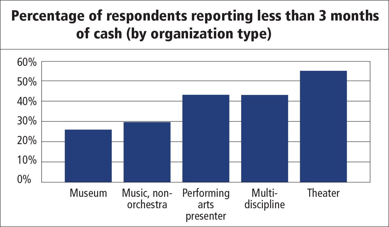 NFF asked respondents to indicate months of cash by dividing total cash by average monthly operating expenses. When reviewing months of cash for all arts and culture respondents, we found that 39 percent indicated less than three months of cash; 15 percent actually indicated less than one month. A more nuanced view emerges when viewing months of cash by budget size and sector. As depicted in the graphs, larger organizations typically have more months of cash on hand, as do museums and music (non-orchestra) organizations.