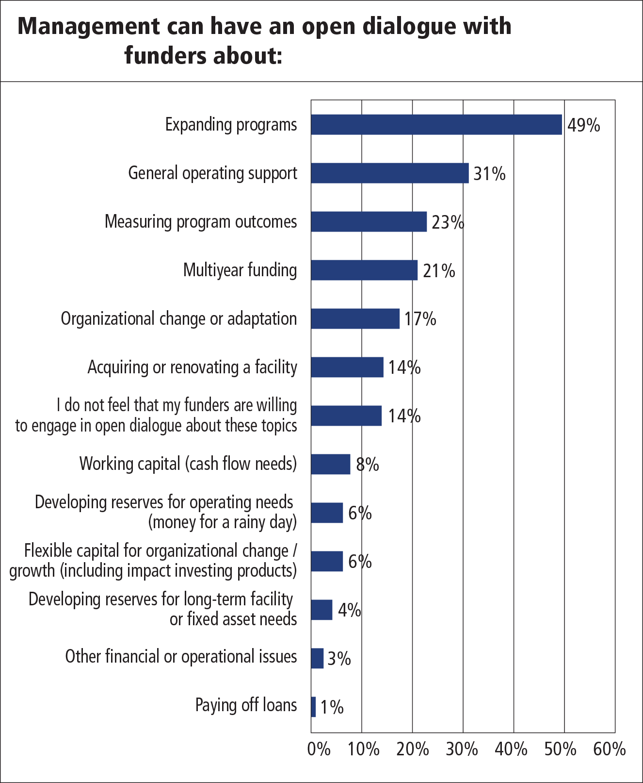 There are vast opportunities for nonprofits and funders to work together to build more adaptable organizations, meet community needs, and invest in artistic aspirations. We counsel our philanthropic partners to first remember that the majority of respondents report being “most comfortable” having an open dialogue with funders about the expansion of programs and that funder dialogue continues to emphasize program expansion over longer-term balance sheet needs, including the capital necessary to adapt and change to the environment (as depicted in the graph). With that, the recommendations below are based on the guidance that funders nurture the platform for an honest and authentic conversation with grantees about the organization’s core needs, in addition to programmatic needs: