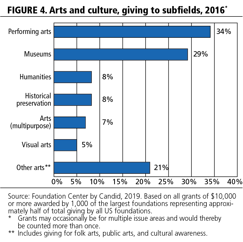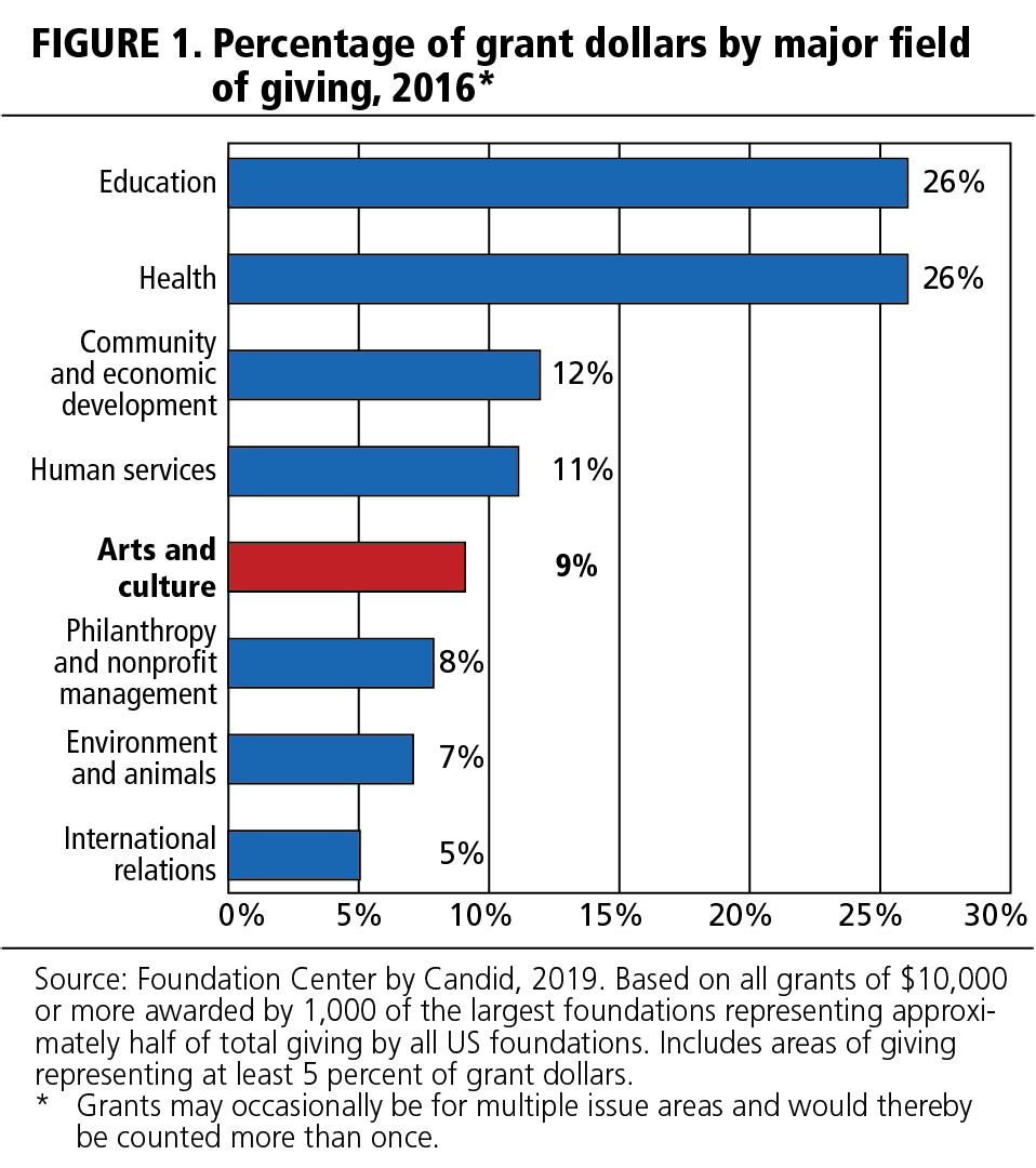 The arts compared to other foundation fields of giving. The three largest categories of support tracked by Candid (formerly Foundation Center) are program support, general operating support, and capital support.