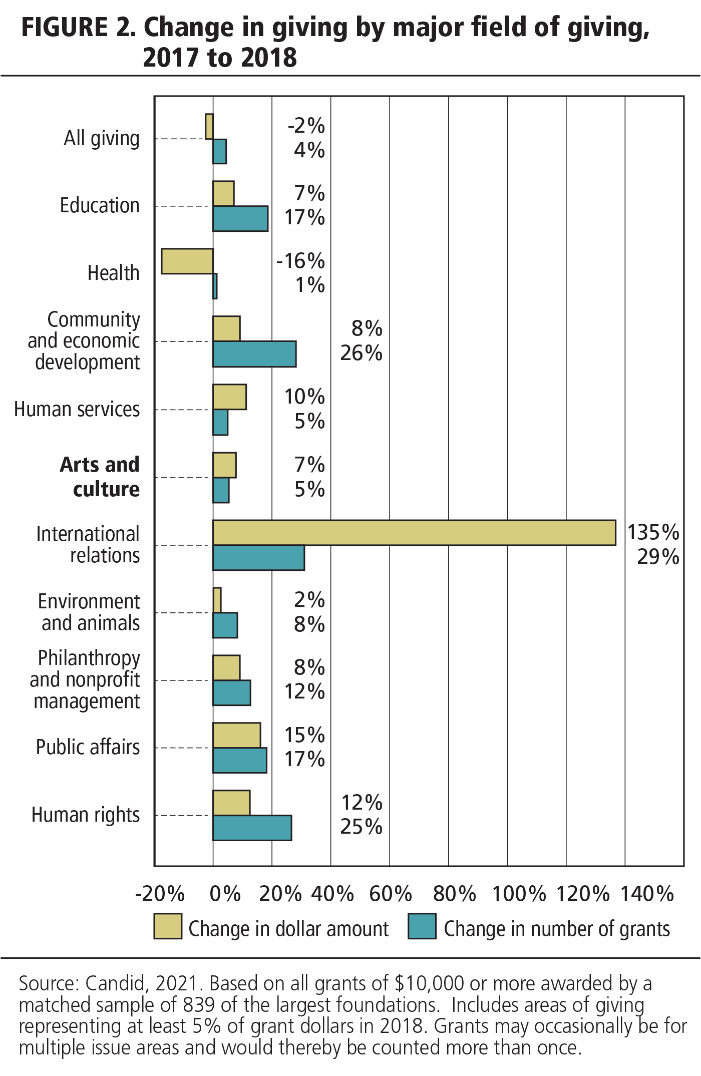 Every year and in all funding areas, a few very large grants can skew overall totals, creating distortions in long-term grantmaking trends. In 2018, 22 arts and culture grants provided at least $10 million, and instances where these grants had a notable impact on grantmaking patterns are identified throughout this analysis. Yet despite the potential fluctuations caused by these exceptional grants, Candid data in all fields have always included them, providing consistency over time.3