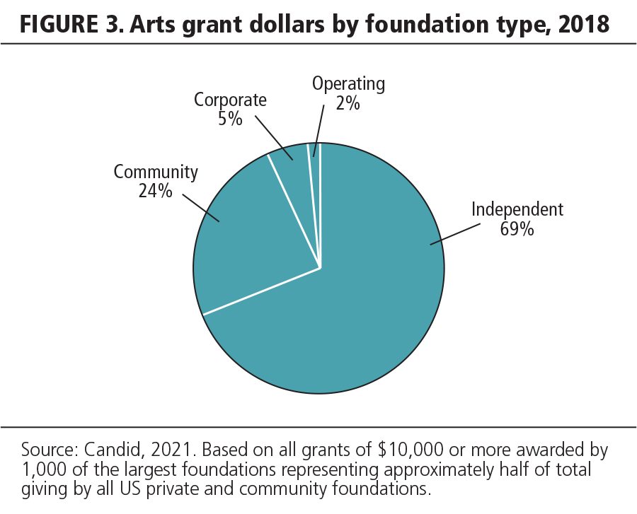 Source: Candid, 2021. Based on all grants of $10,000 or more awarded by 1,000 of the largest foundations representing approximately half of total giving by all US private and community foundations. Grants may occasionally be for multiple support stategies, e.g., for new works and for endowment, and would thereby be counted twice.