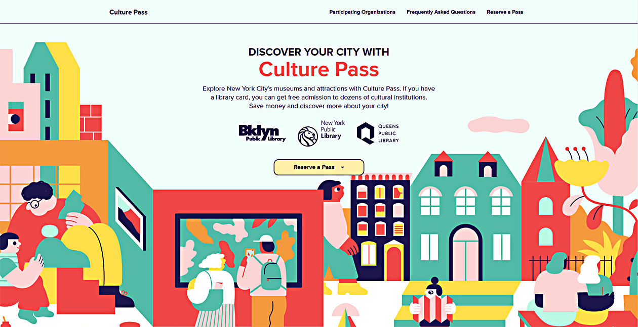 For the libraries, lending day passes to museums is a completely natural idea. Libraries have long used digital platforms to lend out ebooks, magazines, audio materials, and movies. They regularly lend out various types of equipment, including laptops, Internet hotspots, musical instruments, and energy audit kits. In the 1950s, Brooklyn Public Library lent out paintings by notable local artists; anyone with a library card could choose a piece of art, check it out from the library, and hang it in their living room for a limited period. However, since most residents associate libraries with physical books, marketing Culture Pass and explaining how it works were critical to its success. To do this, a consistent Culture Pass identity was created using the work of a local illustrator, along with a short explainer video and thousands of physical pamphlets, posters, buttons, and stickers. In fall 2018, advertisements ran on city bus shelters and LinkNYC kiosks in our targeted neighborhoods. The Brooklyn, New York (serving Staten Island, Manhattan, and the Bronx), and Queens library systems all marketed (and continue to market) the service online with regular social media posts as well as with brochures in every branch. In some branches, librarians created “know before you go” book displays featuring catalogs, monographs, and other books relevant to new and ongoing museum exhibitions.