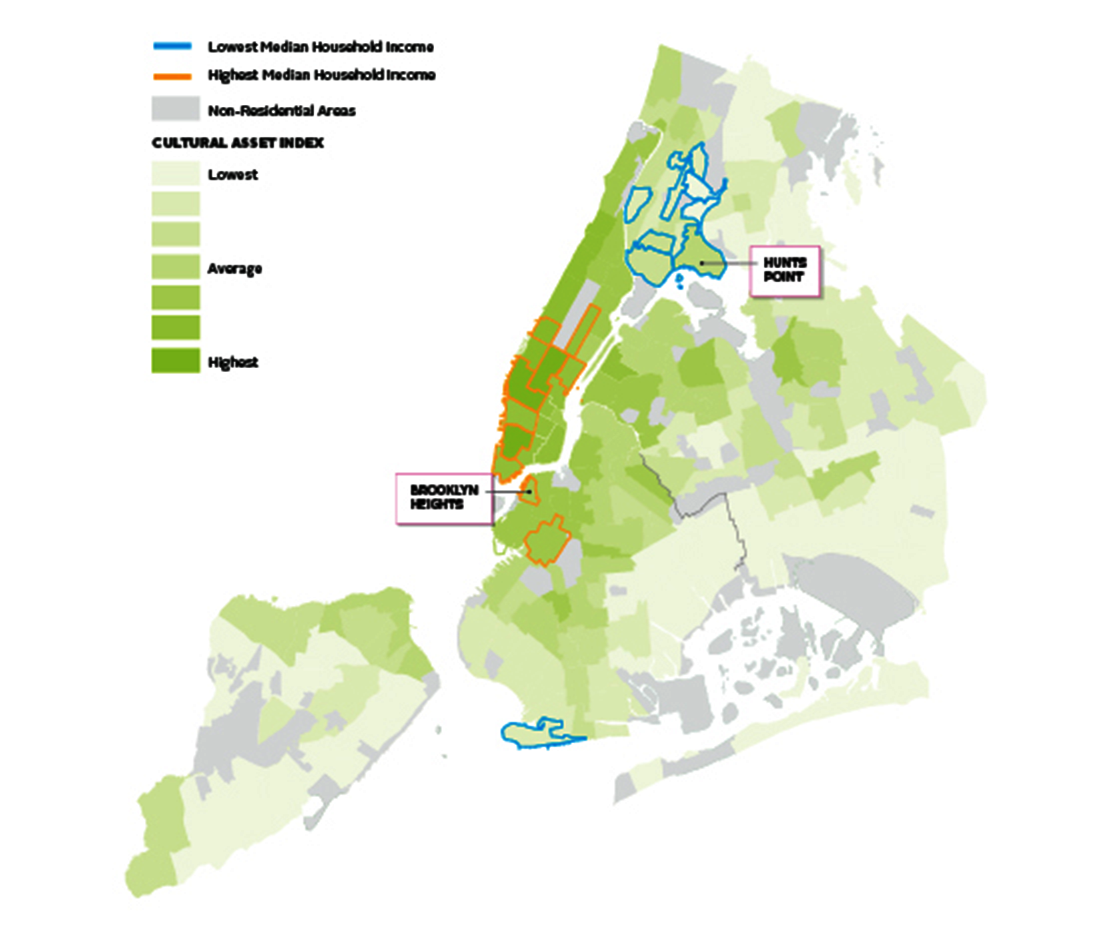 CULTURAL ASSETS IN NEW YORK CITY. The Social Impact of the Arts Project (SIAP) study found that cultural assets are unequally distributed throughout the city’s neighborhoods with significantly fewer cultural resources located in low-income communities and communities of color. According to the study, “cultural resources in the city are extremely unequally distributed. Manhattan below 125th Street and neighborhoods near downtown Brooklyn have extraordinarily high levels of cultural resources, while many neighborhoods in all boroughs have far fewer. If we break the city’s neighborhoods into five strata based on their overall economic status, we find that the wealthiest have many times more cultural resources than other parts of the city.” Courtesy of the NYC Department of Cultural Affairs, from the 2017 CreateNYC Cultural Plan.