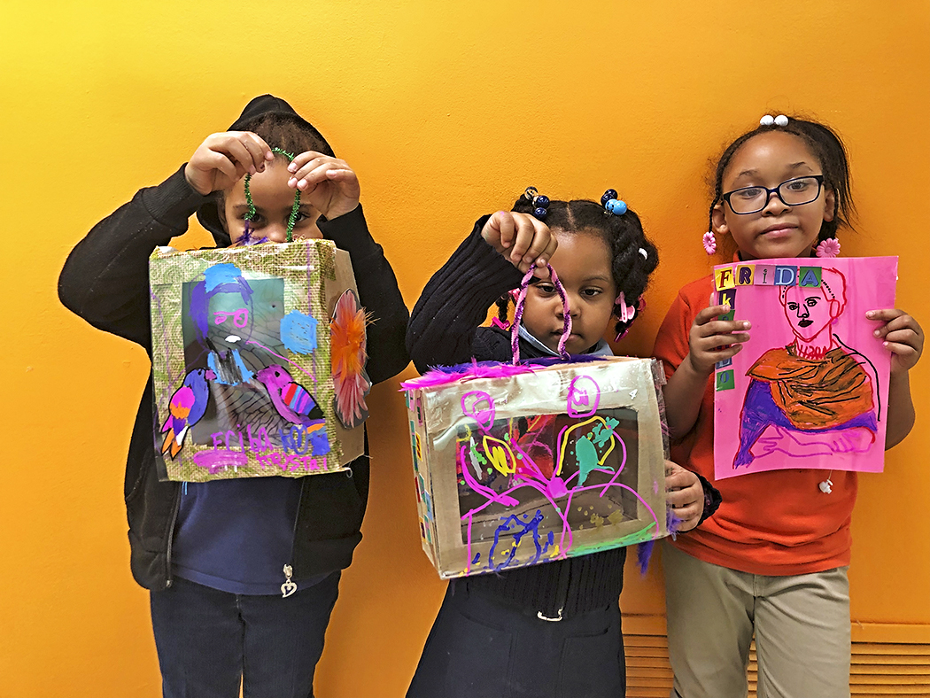 Children show off artwork created during the artist-led Civic Kids program at the Children’s Museum of the Arts at the Brooklyn Public Library, Saratoga Branch, part of the Culture Pass program. Photo courtesy of Brooklyn Public Library.