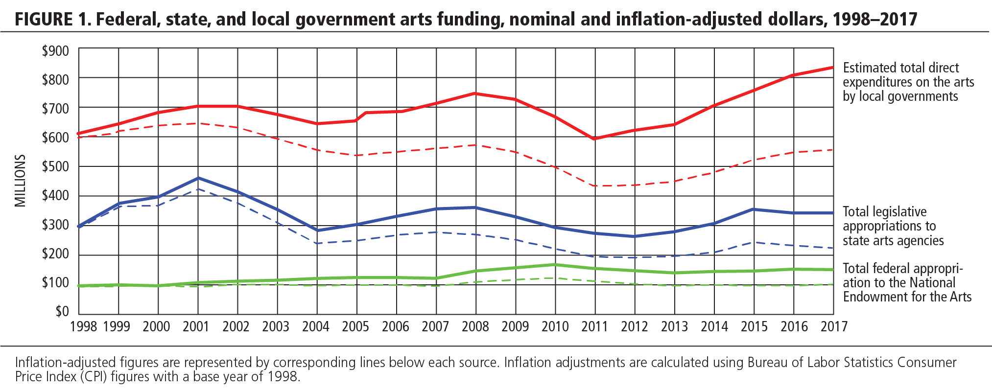 This profile draws on local spending estimates from Americans for the Arts; National Assembly of State Arts Agencies’ legislative appropriations surveys of the nation’s state and jurisdictional arts agencies; and appropriations data from the National Endowment for the Arts. As of this writing, the most recent data available about federal and local funding for the arts are from fiscal year 2017. Fiscal year 2017 and 2018 data for state arts agencies are available from www.nasaa-arts.org. Constant dollar adjustments for inflation are calculated using Bureau of Labor Statistics Consumer Price Index (CPI) figures with a base year of 1998. Per capita calculations are based on national population estimates from the US Census Bureau.