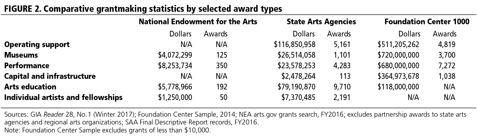 Sources: GIA Reader 28, No. 1 (Winter 2017); Foundation Center Sample, 2014; NEA arts.gov grants search, FY2016; excludes partnership awards to state arts agencies and regional arts organizations; SAA Final Descriptive Report records, FY2016.