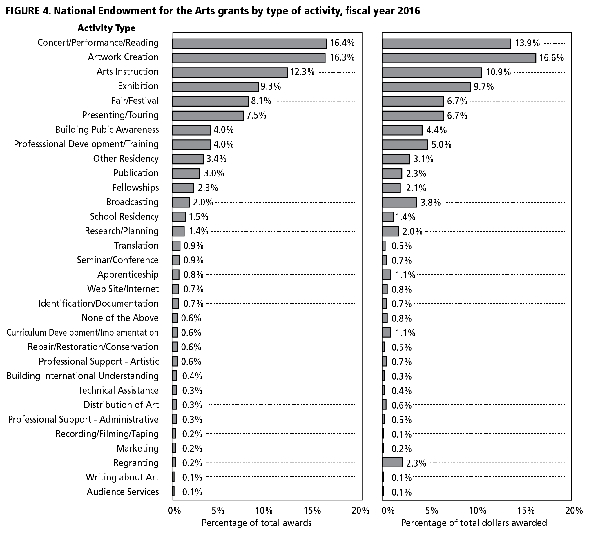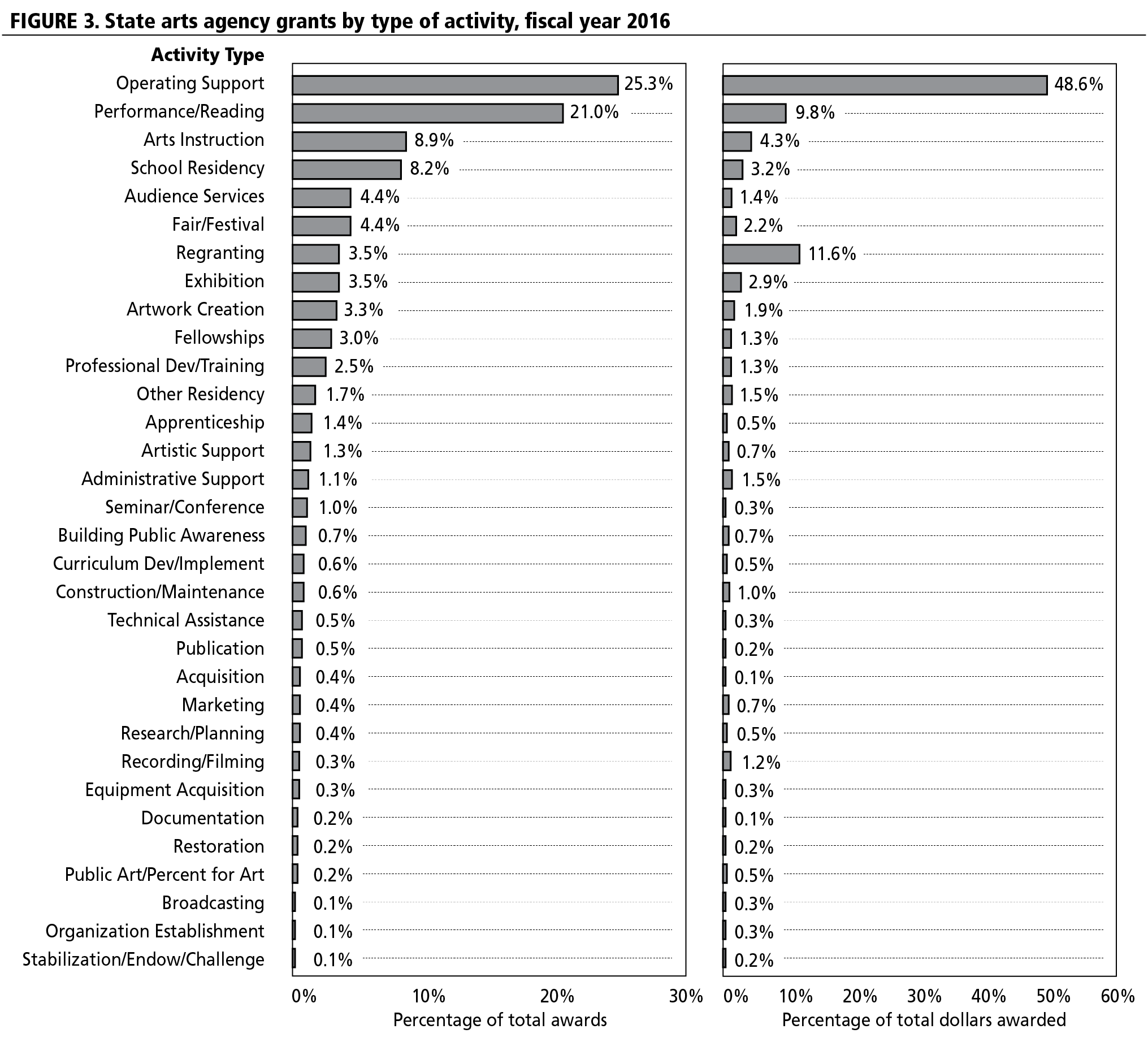 Outside of operating support, it is possible to compare a few other grant categories and activity types. Foundations, states, and the NEA all make investments in museums, the performing arts, and arts education. A key contrast between public and private sectors is investment in capital construction and physical infrastructure. The NEA does not provide funding for capital construction, and relatively few state arts agencies make grants for facilities. Foundations bear the load for funding physical cultural infrastructure in the United States. Another challenging topic for grantmakers is investment in individual artists and fellowships.4 The NEA makes investments in individual artists through National Heritage Fellows, Jazz Masters, and Literature Fellowships. Additionally, NEA funds support state arts agencies, many of which devote large portions of their grants to individual artists.5 In fiscal year 2016, state arts agencies made 2,191 awards to individual artists. When compared to other types of applicants, awards to individual artists were the second most frequent type of award made by state arts agencies.